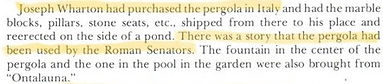 The Pergola as it now exists in the rear gardens at "Melmar" is a ~1400 sq ft ancient roman marble and limestone patio with solid marble footers, railings, balusters, pillars, and 2 in thick marble floor tile​ which was originally imported by Joseph Wharton to his Philadelphia mansion, "Ontalauna" from Rome where is it said to have been used by Roman Senators! The Pergola was relocated to his daughter Joanna Wharton Biddle's "Melmar" mansion after his death​​